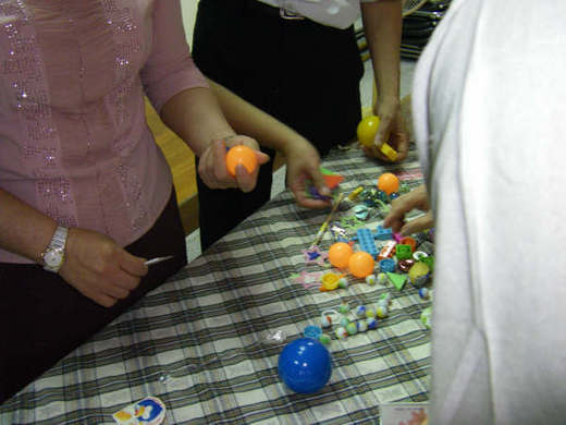 我先邀請學員們閉上眼睛靜下心來,回想過去課程中所經歷過的種種,趁著大家閉上眼睛的時候,我便悄悄地把皮箱裡的東西倒在一塊布上。待準備妥當,便邀請學員睜開眼睛,一一走到布前挑選三樣足以帶表參與這個訓練經驗的小物品,回到大團體裡和大家分享。