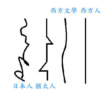 基本上西方人陳述時多直來直往,在文學作品中雖有修飾,但仍有一個明顯的脈絡可尋,猶太人說話則會跳開來,然後再拉回正軌(我不是很清楚,但是原住民朋友其實說話有時也有這種跳躍的習慣),日本人則是拐彎抹角說了半天,然後還是很難懂(想想日文的句尾變化就能理解為何有這樣的看法了)。