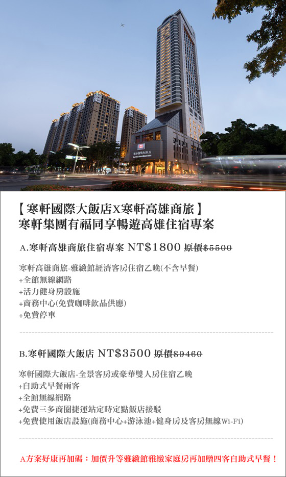 寒軒國際大飯店X寒軒高雄商旅-寒軒集團有福同享暢遊高雄住宿專案