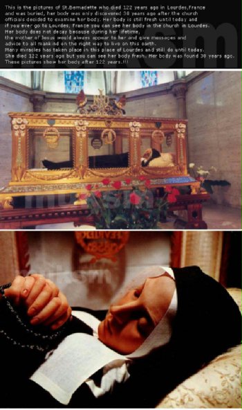 她的遺體沒有腐化,是由於她生前不時遇見聖母,並遵守祂所告知的人生在世正確的生活方式.一直到現在,仍然有不少神蹟發生在Lourdes.