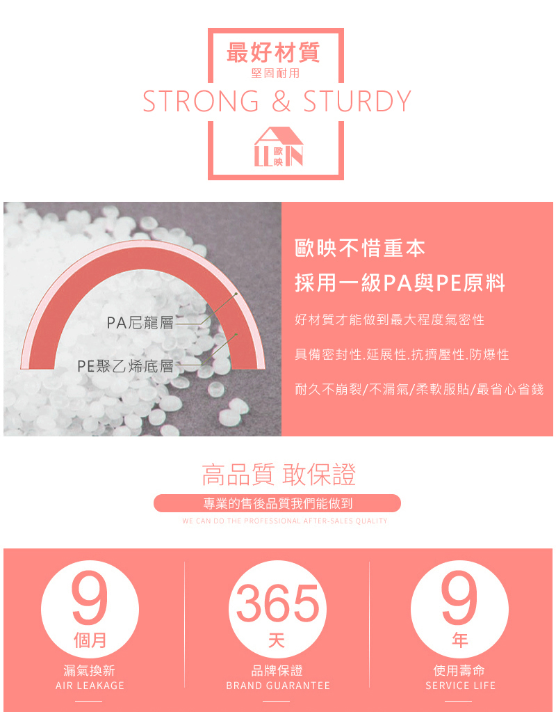 ●獨家品質三大保證-9個月漏氣換新、365天品牌保證、9年使用壽命