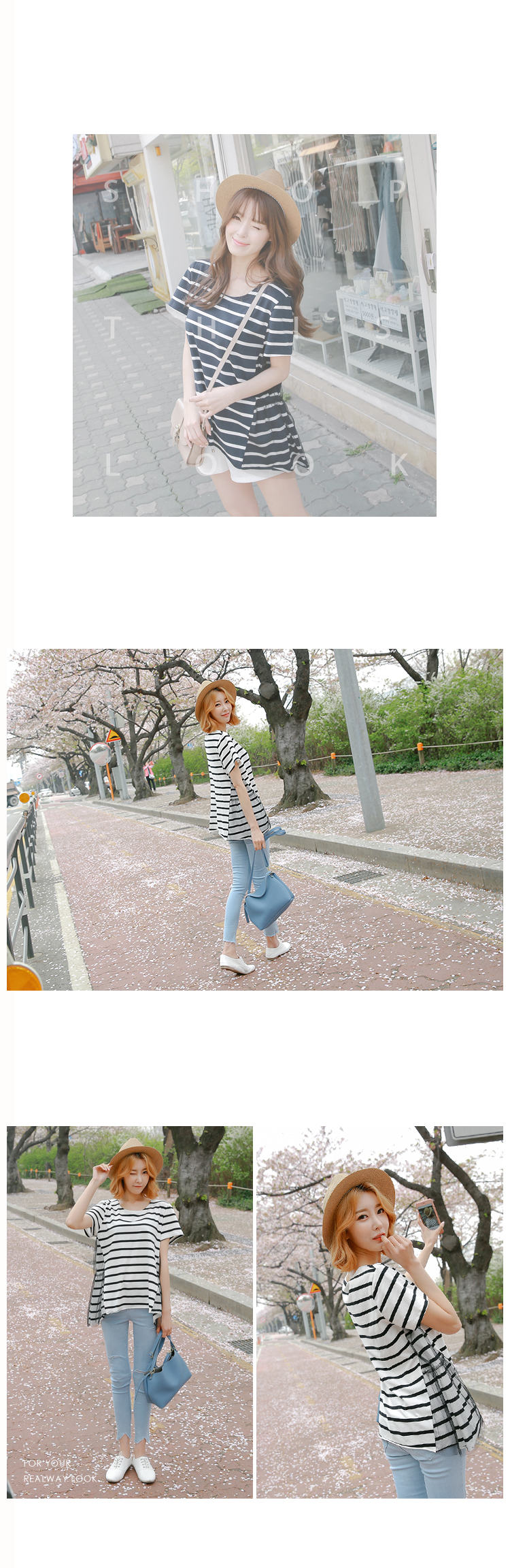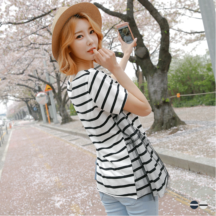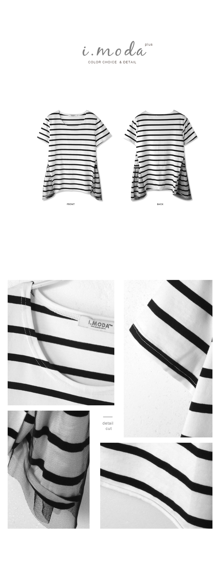 0511新品 輕甜A字側擺拼接網紗條紋上衣.2色