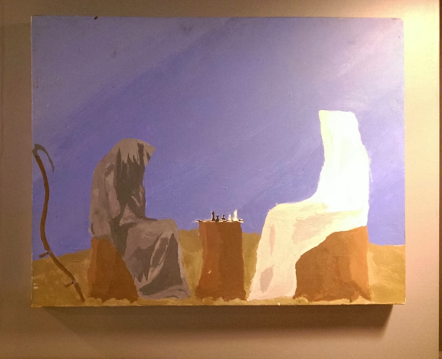 因為動不了長袍袖子底下的手臂,他們根本無法下完那盤棋。死神和祂的對手無精打采地癱坐在懸崖邊。藍天中明亮的對角線配上陰沉的主題,引人注目的對比將這幅畫作乖僻、辛辣的意味和達達主義嶄露無遺。把主角們用連帽長袍包住,畫家巧妙的避免了描繪人類形體的挑戰。這位匿名的畫家強硬的隔絕了所有普遍繪畫會遭遇的疑難,好比畫作的格局、色彩、材質、象徵意義、隱喻和其他絕大多數可能的成見。遷就成見將傳統現代藝術家變成了藉直接創意的展示而擁有特權的傳播者。