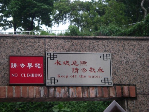 這一天我們到兒童育樂中心度過兒童節,姐夫看見一塊告示牌,忍不住要說笑給我們聽,告示牌上寫著:『水域危險請勿戲水』英文是『Keep off the water.』姐夫說英文的翻譯應該是:『請勿在水面上行走。』那肯定不會有人違規的!這下子姐夫可是扳回一成囉。