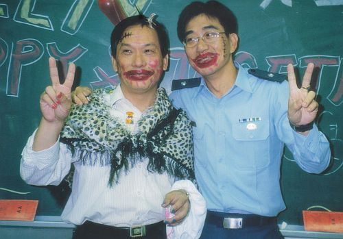 相片說明: 萬聖節那天也把老師跟平常嚴肅的教官也拉進來比賽,班上同學替他們精心妝扮的模樣^^