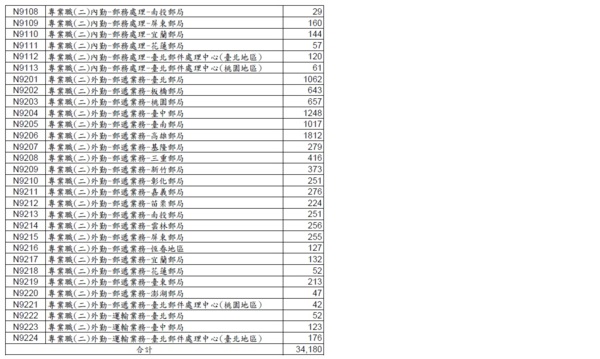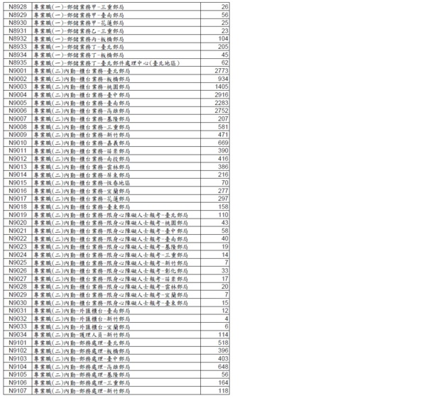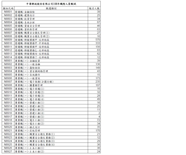 中華郵政股份有限公司108年職階人員甄試各類組報名人數統計