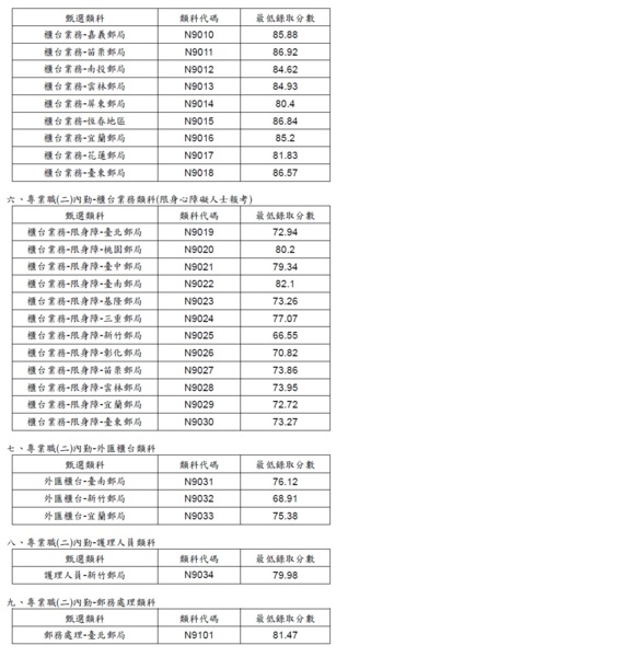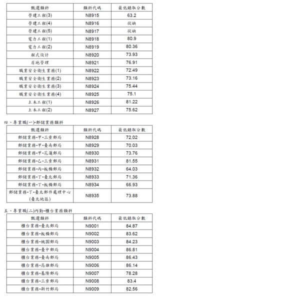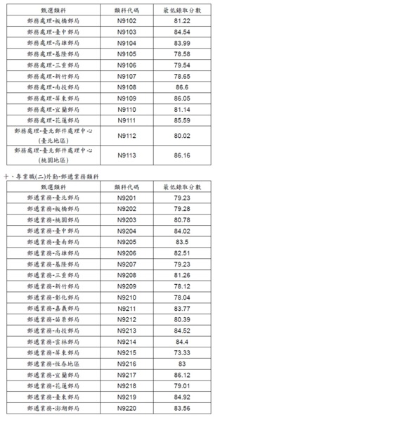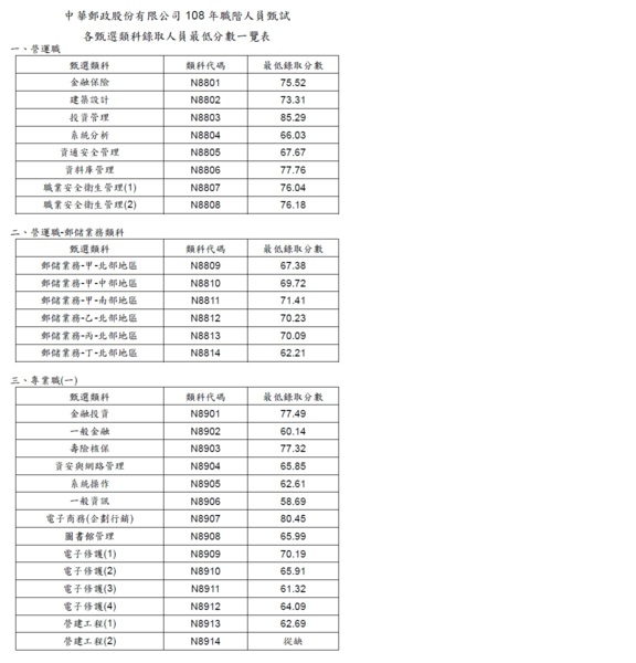 中華郵政股份有限公司108年職階人員甄試各甄選類科錄取人員最低分數一覽表