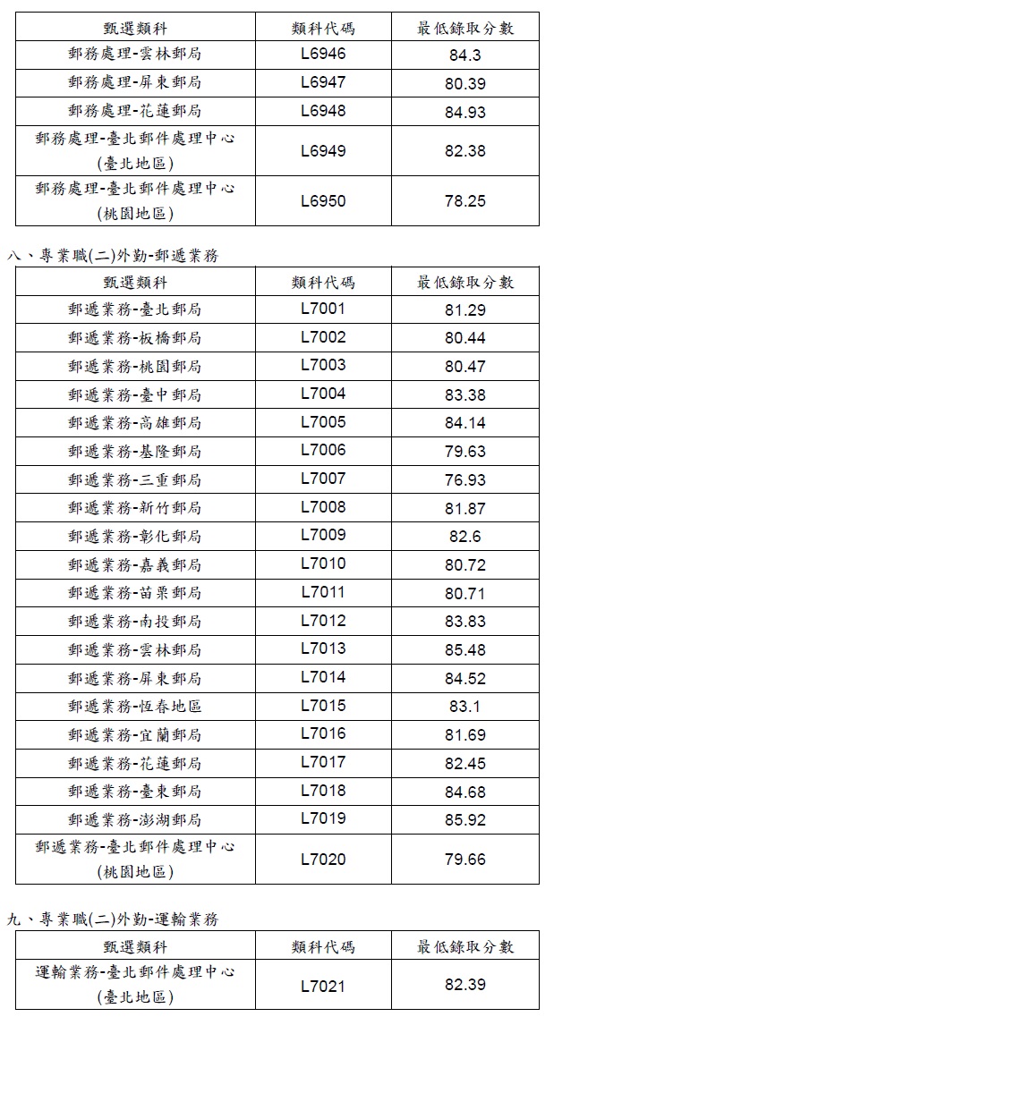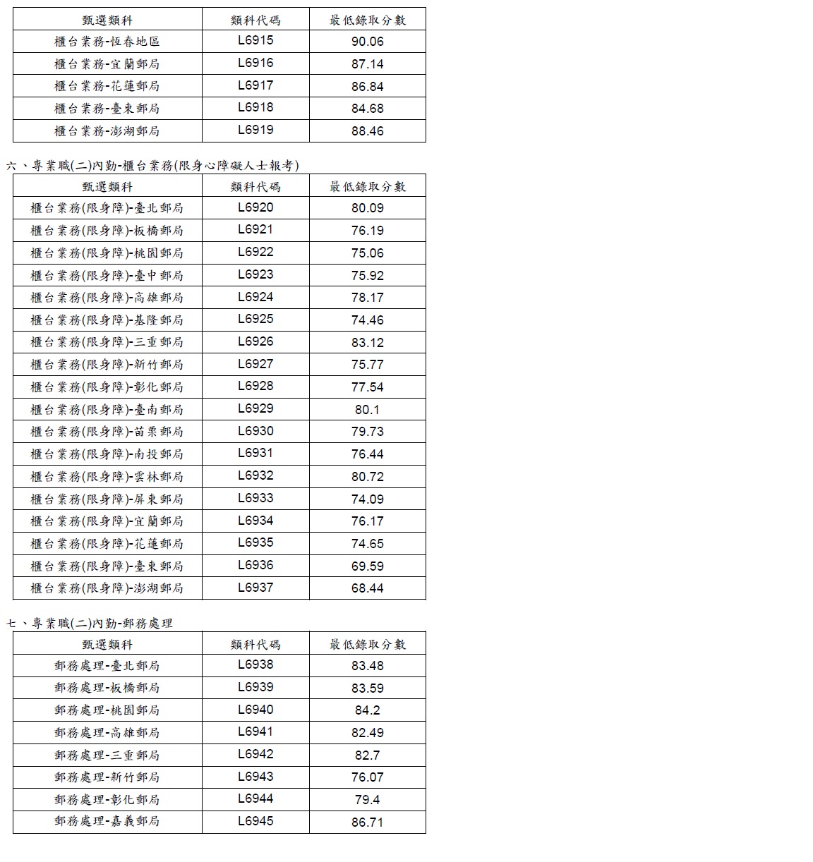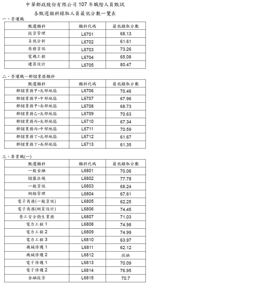 中華郵政股份有限公司107年職階人員甄試各甄選類科錄取人員最低分數一覽表