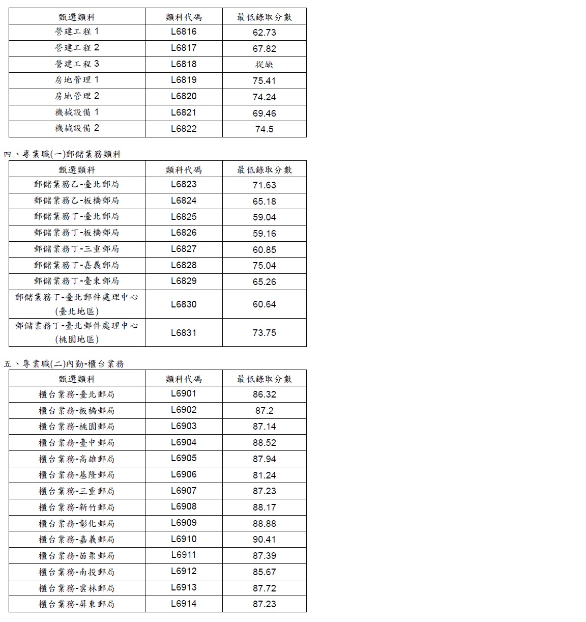 中華郵政股份有限公司108年職階人員甄試各甄選類科錄取人員最低分數一覽表
