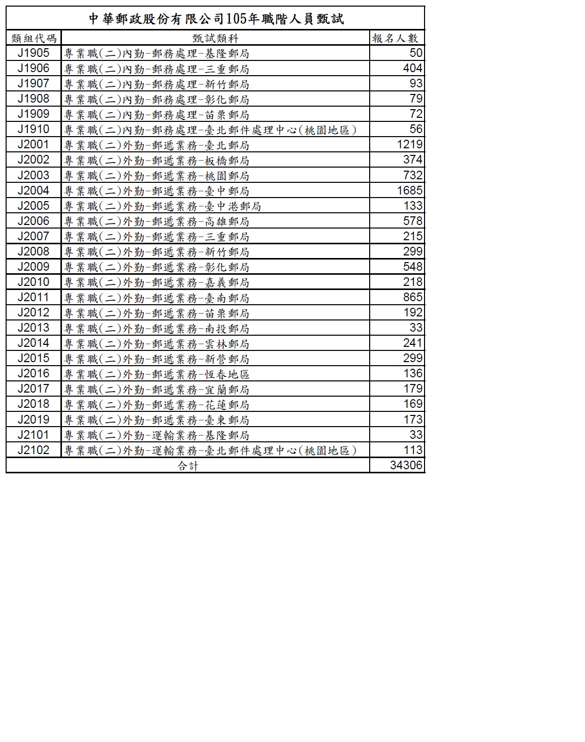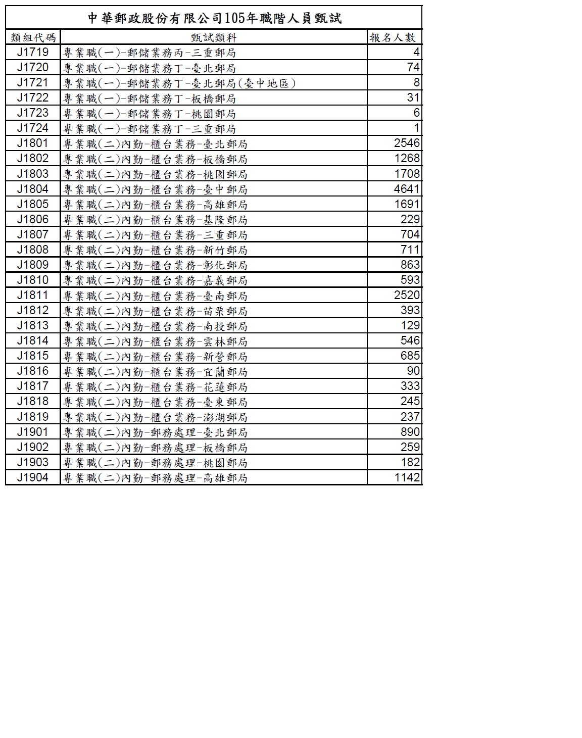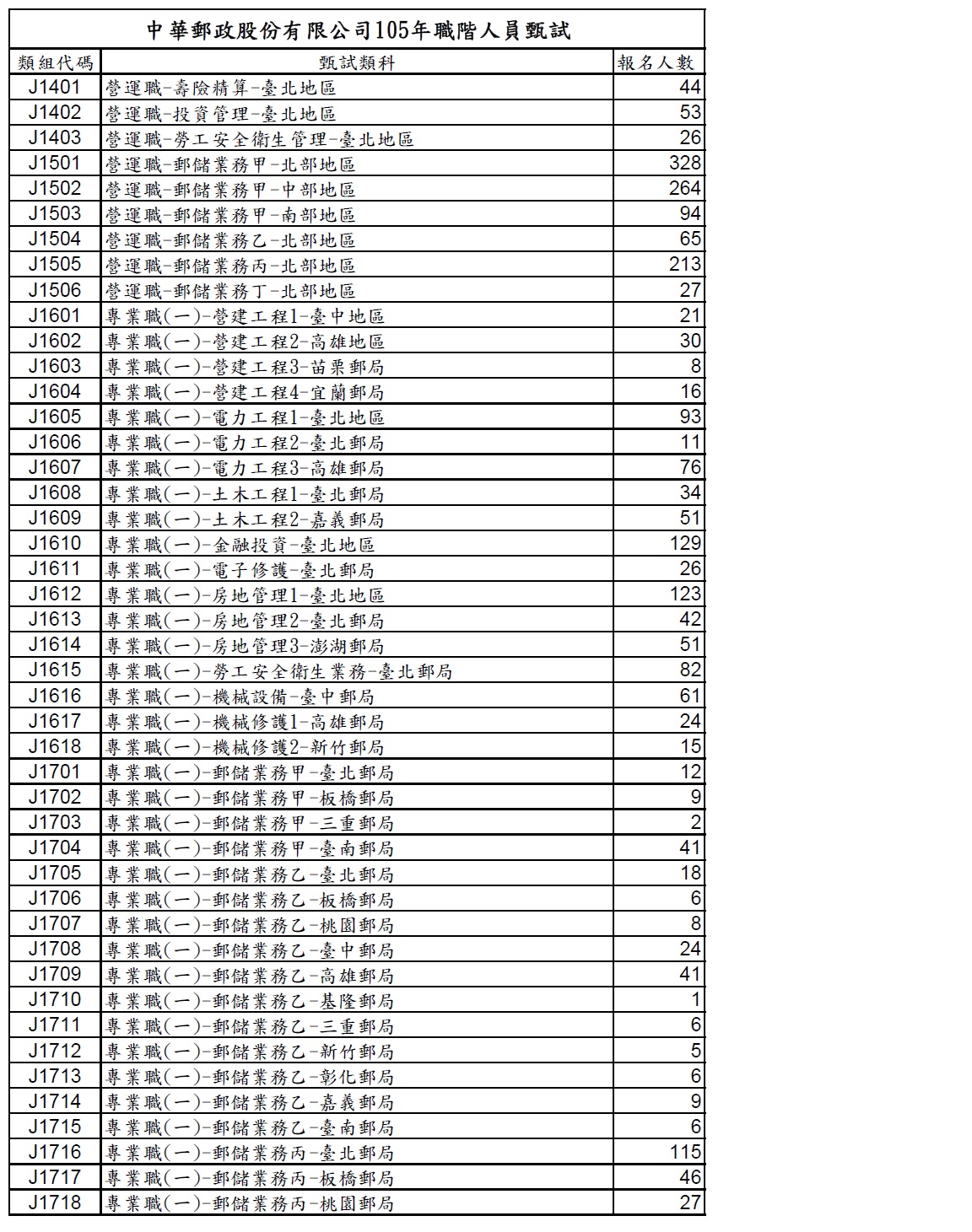 中華郵政股份有限公司105年職階人員甄試各類組報名人數統計