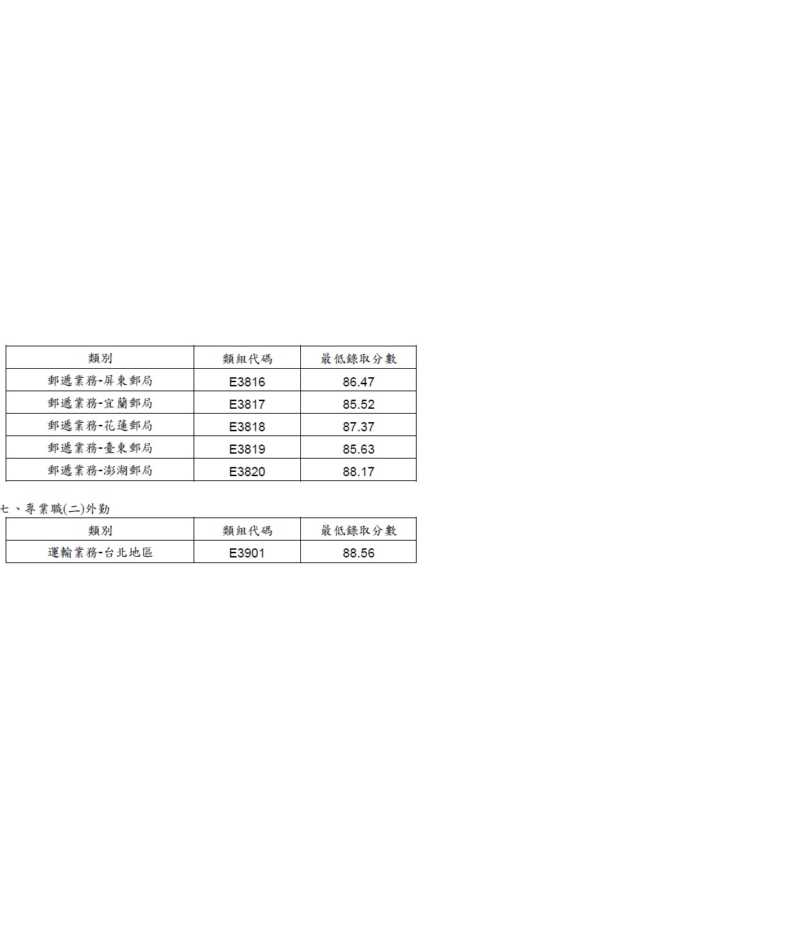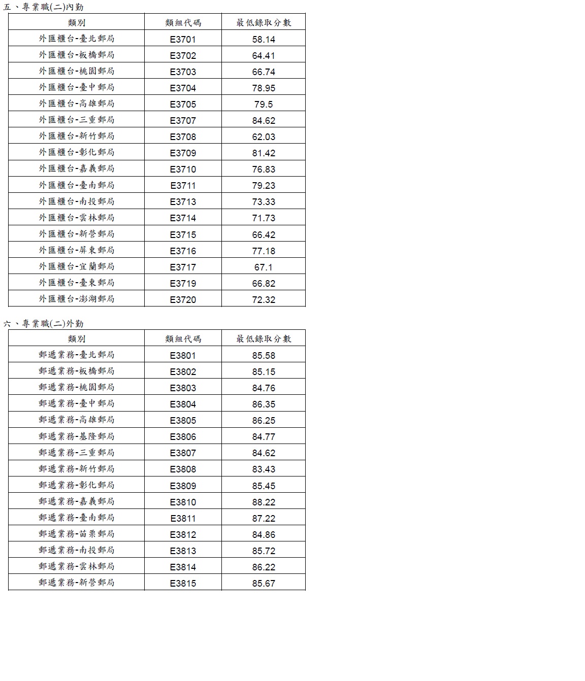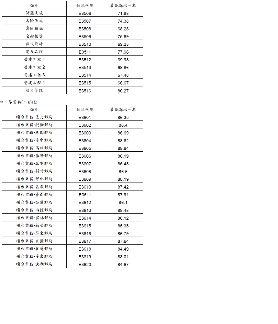 中華郵政股份有限公司101年職階人員甄試各甄選類科錄取人員最低分數一覽表