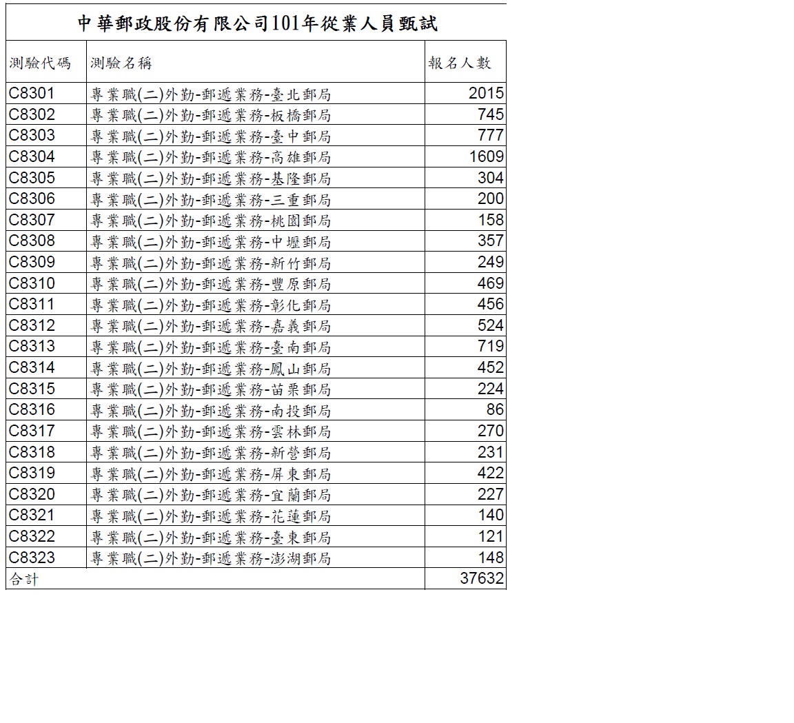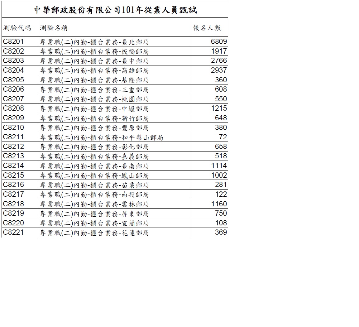中華郵政股份有限公司101年職階人員甄試各類組報名人數統計