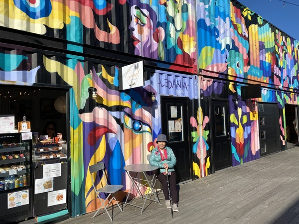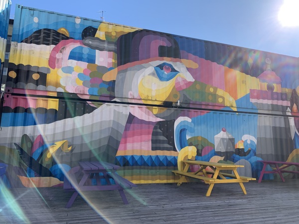 商圈的塗鴉巷可說是充滿了藝術氣息,文獻上說,兩邊兩層貨楃高的畫作分別是由兩位國際上聞名的藝術家在2022 年所繪。藝術家的背景不同因而呈現出不同風格的畫作。