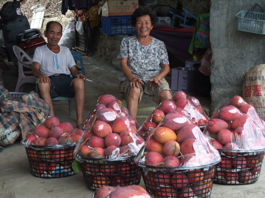 嚴福春幫我搬到車子裡,然後臨走前,嚴爸爸也出現了,我拍了幾張嚴媽媽他們坐在芒果堆旁的照片做紀念。