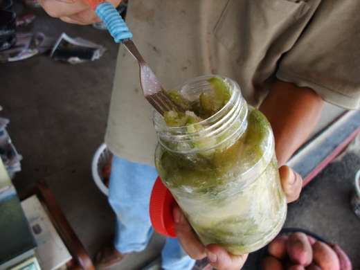 同樣是路邊賣芒果的,那間小農舍實在小到太不起眼了!只容得下我的飛車經過一瞥,印象中有一個「老太太坐在芒果堆旁」的模糊殘影。