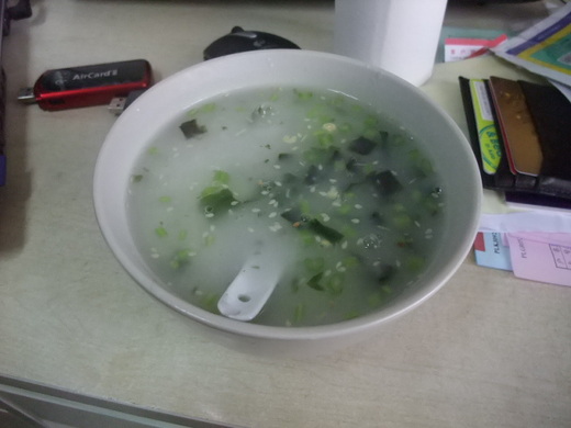 空腹許久,終於在剛剛晚餐時分,隱約感覺有一點「胃口」,又深怕這是病情反撲的陷阱,於是決定先熬一碗粥,裡頭放的是來自花蓮的米、日本的海帶芽,以及味王素芽湯的調味粉末,再加上前天剛洗淨冰切的芹菜。
