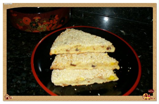 - 芝麻要用手輕輕按壓,才會黏在餅皮上。否則會掉滿地。也可以稍微把餅皮沾濕,就可以黏得牢。