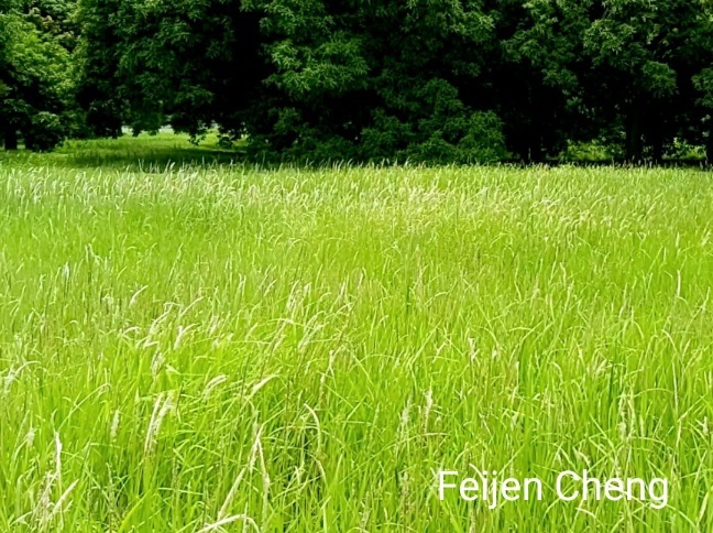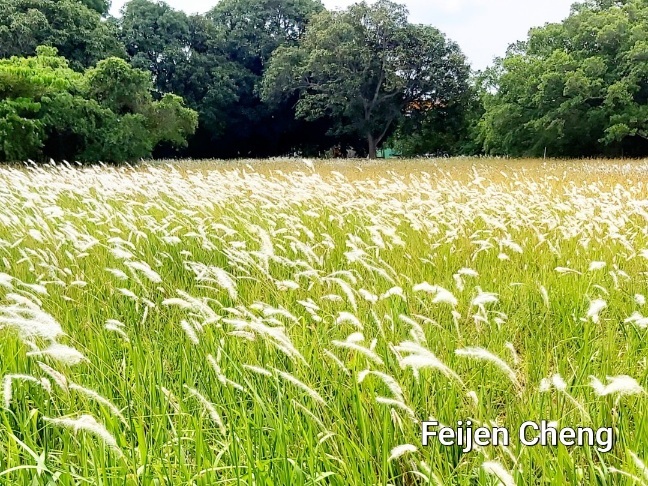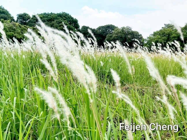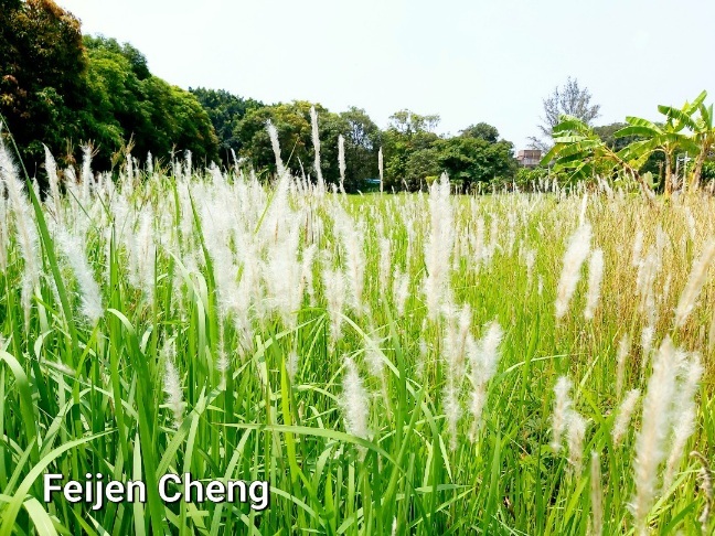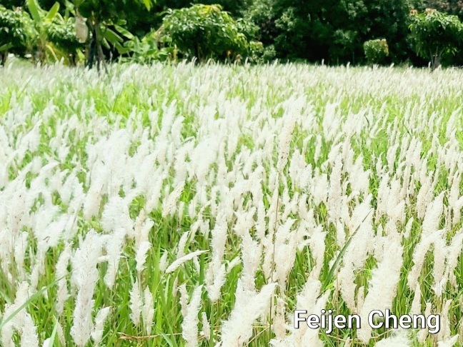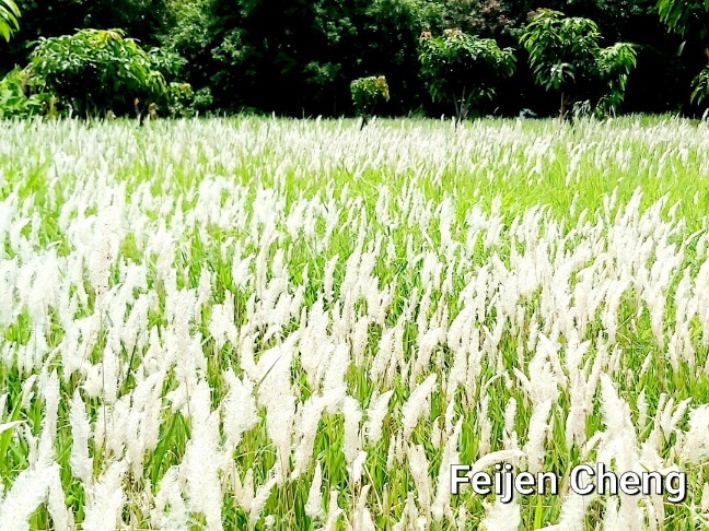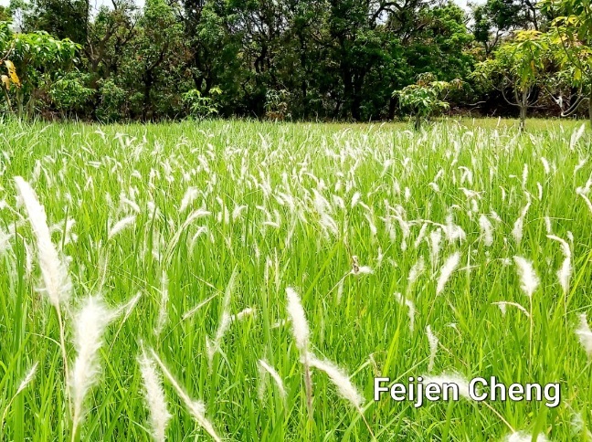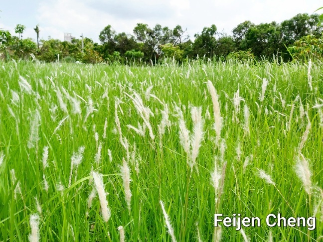 樹木旁一小片白茅沒有藍天襯托,但翠綠青草突顯白茅棉絮的美,如果能長滿一大片白茅,陽光灑落下來,閃著銀白光芒的白茅花海一定美極了。