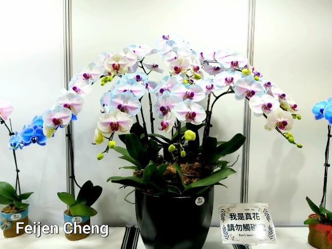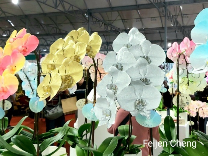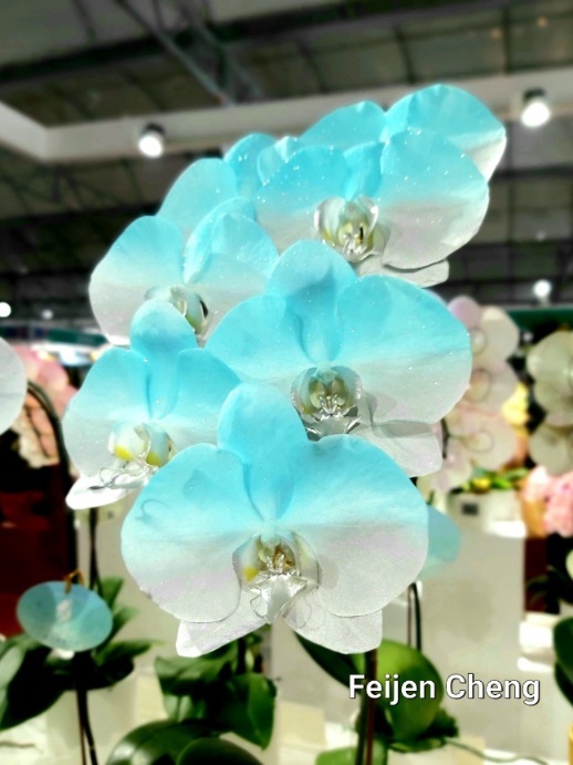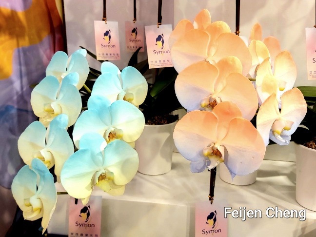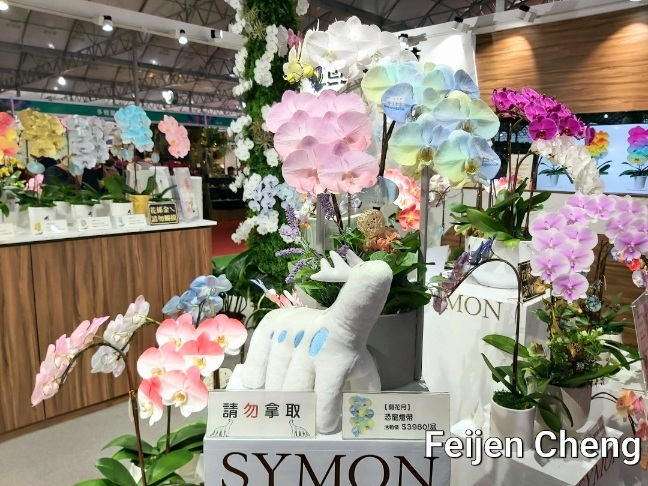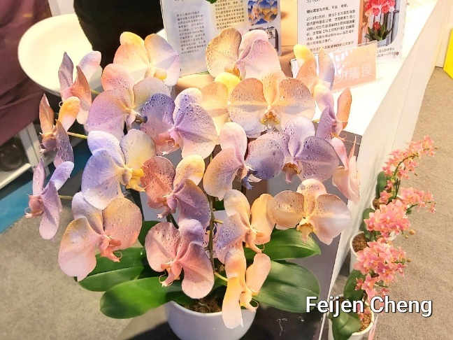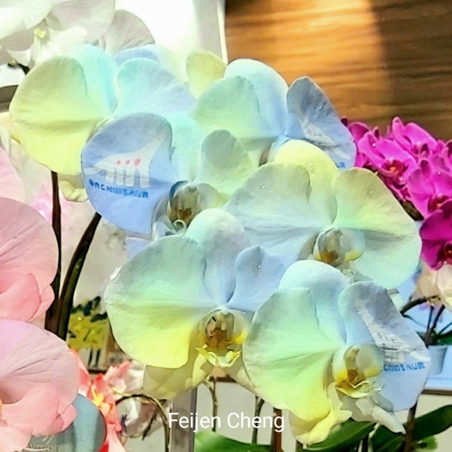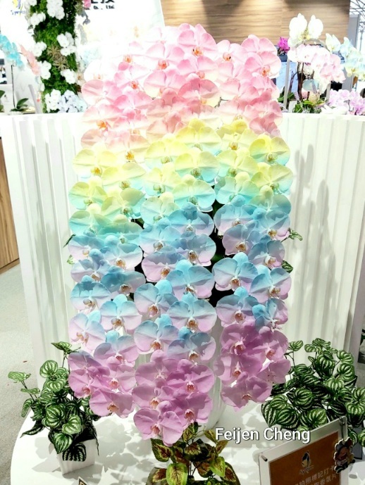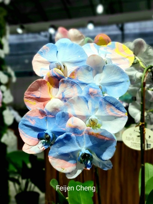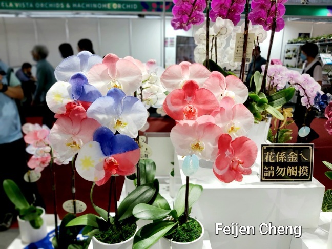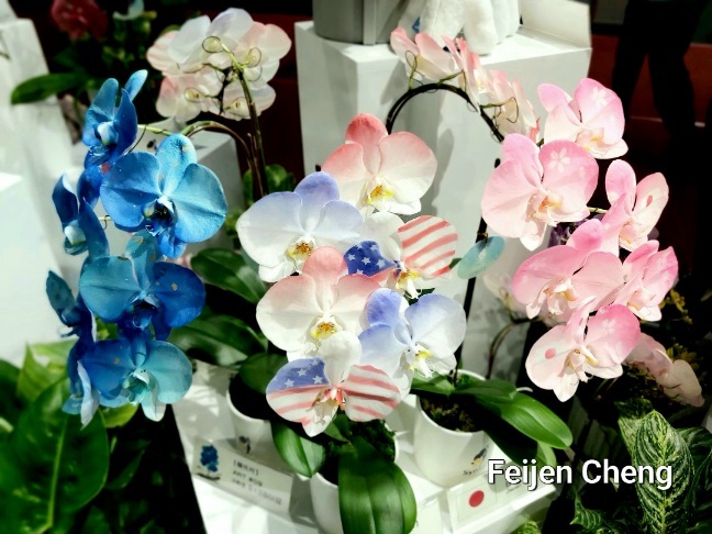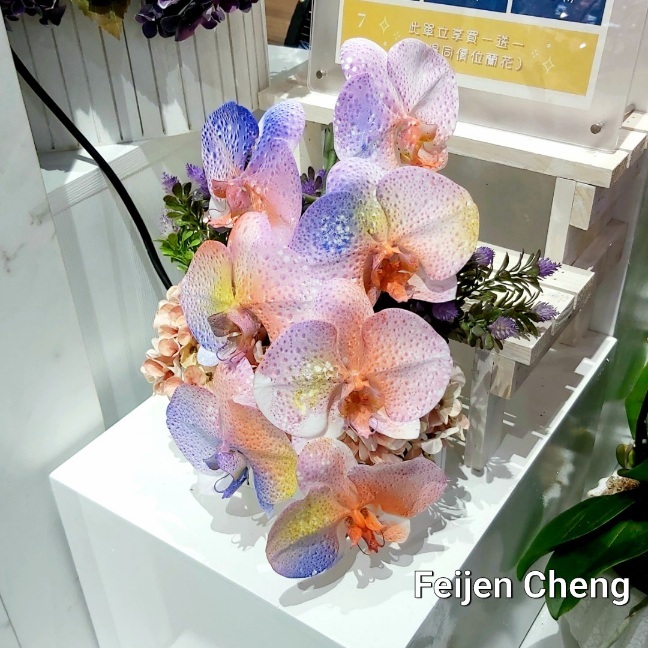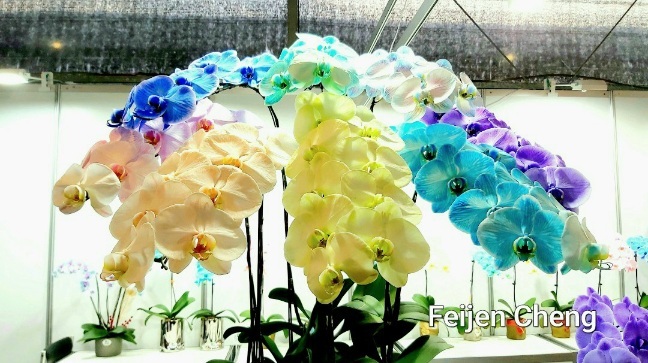 前年在電視上看到噴染蘭花為之著迷,當時在展場沒看到,找了許久才在販賣區找到。去年展出的噴墨蘭花以各國國旗為主題,量不多但已讓人為之驚艷,想不到今年的噴染蘭花色彩更為夢幻繽紛,顛覆以往對蘭花的印象,原來蘭花也能美成這樣。
