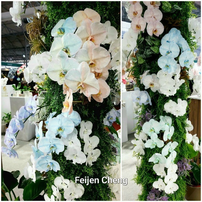 ↑色彩夢幻繽紛的馬卡龍色蘭花堆積成塔,十分搶眼壯觀,造型有點像神奇藥水聖誕樹。(文末有神奇藥水聖誕樹照片)