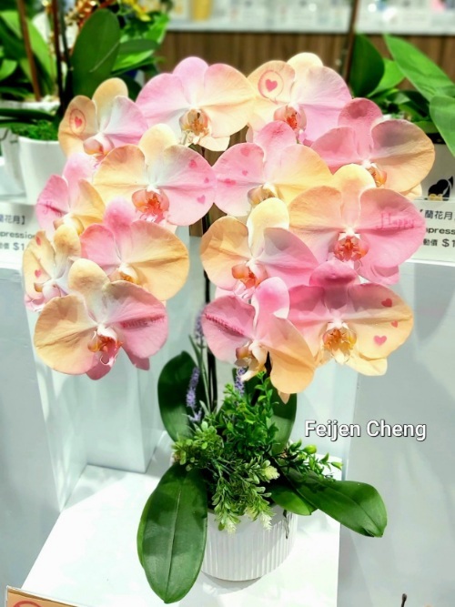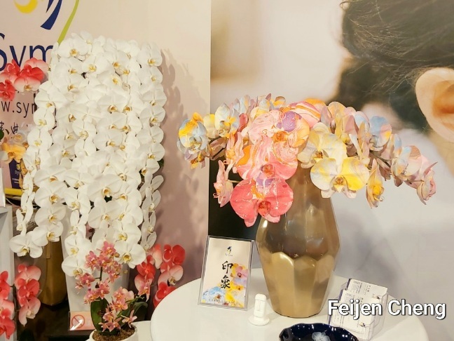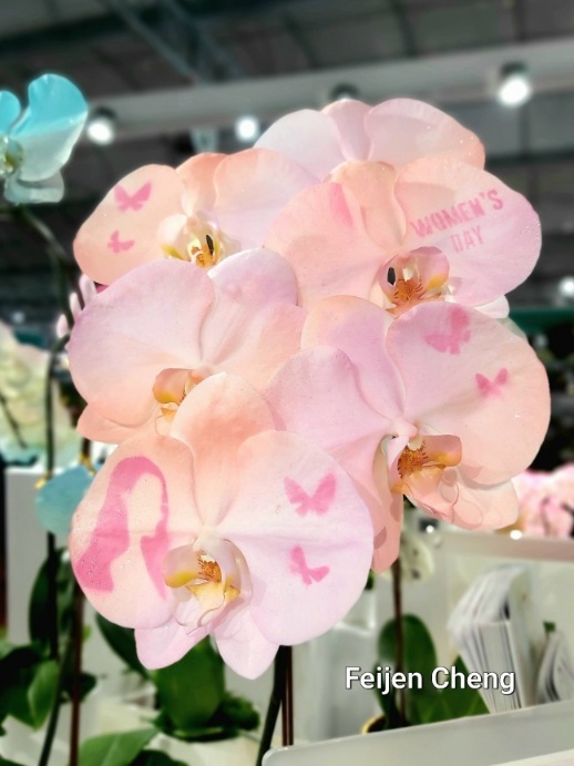 經由奈米噴染技術,白色蝴蝶蘭花朵換上美麗彩衣,夢幻粉、漸層藍、愛心、櫻花……等多種色彩與圖案,彷彿施了魔法,原本樸實典雅的白色蝴蝶蘭變身為繽紛夢幻花朵。