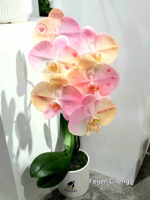 噴染蘭花可搭配節慶活動設計蘭花上的圖案與色彩,如白色情人節Happy White Day 、櫻花季櫻花圖案等。