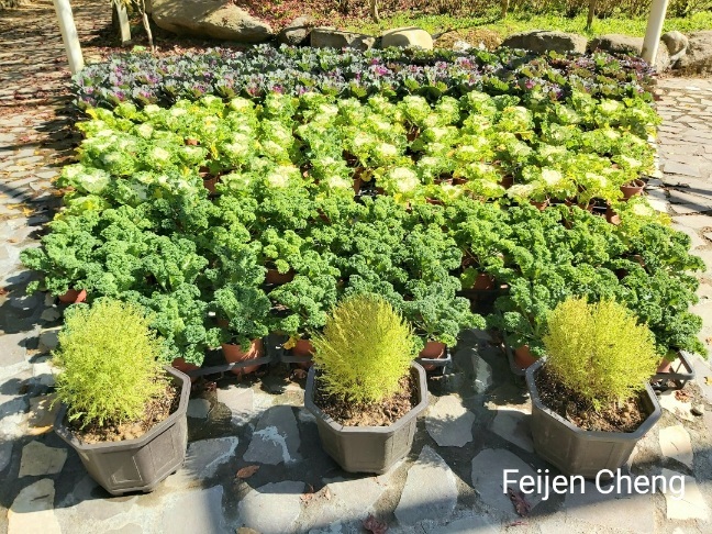 三盆綠色波波草與外觀像高麗菜的葉牡丹