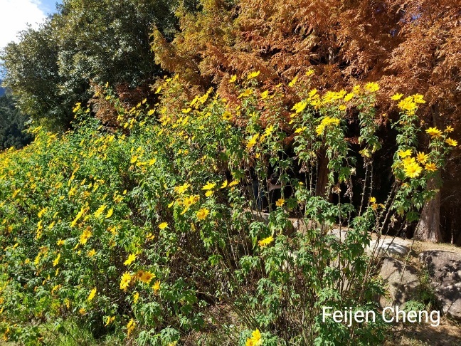 外觀像向日葵的王爺葵花海金黃燦爛,如果沒有逆光,美麗金黃花海與兩旁水杉相互輝映,美不勝收。