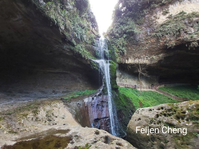 冬季松瀧岩瀑布變成涓涓細流,下方水潭水位不高,讓人再次錯過整排水濂與瀑布同框的壯觀畫面。前年去瀑布水勢滂薄,下面的水濂面積不大,但至少幾處有流水,這次是一片乾涸。