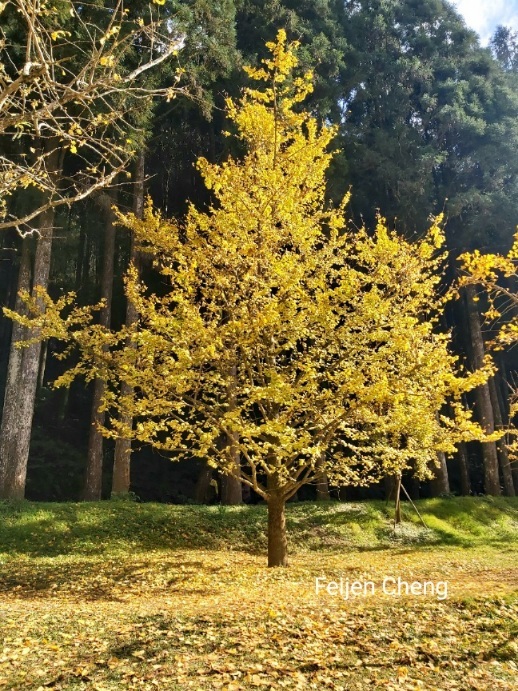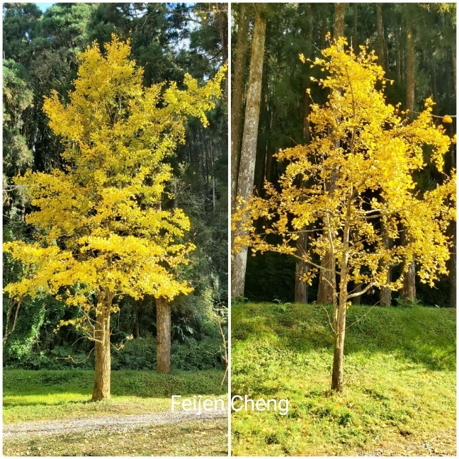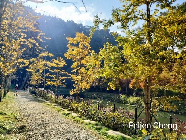 上午在銀杏湖拍銀杏樹沒有日照,銀杏葉不夠金黃迷人,下午下山後看到銀杏湖有陽光,與早上看到完全是不一同層次的美,深深被吸引又去了一趟。當陽光灑落在銀杏樹上,銀杏葉格外金黃耀眼,從遠處看銀杏樹,一棵棵金光閃閃,美麗極了~