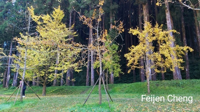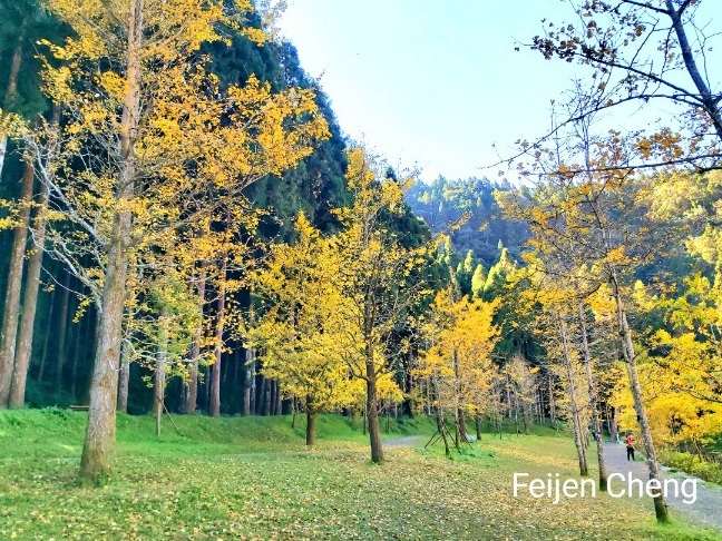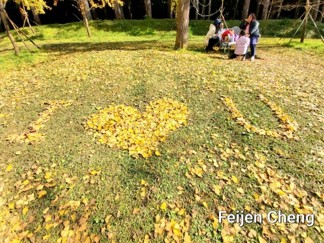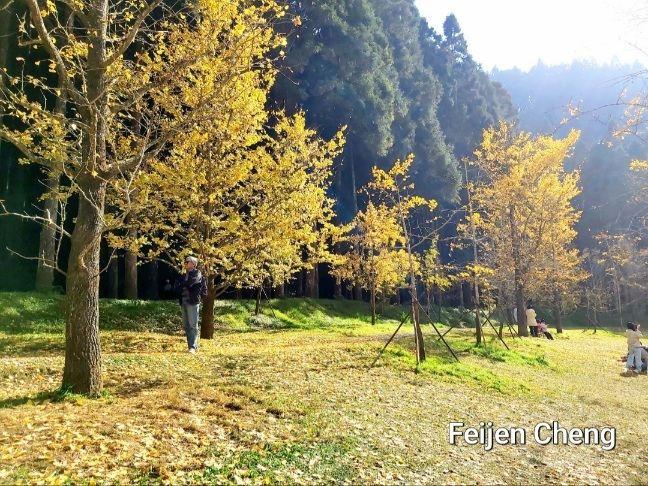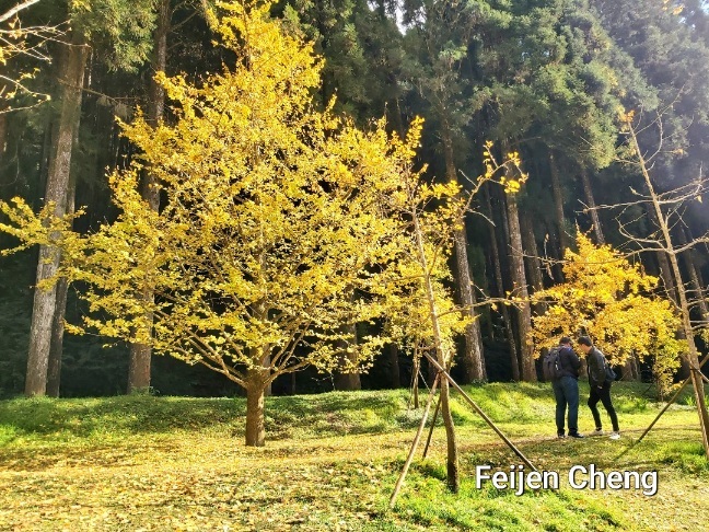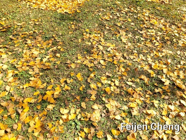 金黃葉子飄落滿地,鋪成一片片金黃地毯,如果提早兩、三天去,是銀杏林最美的時候。