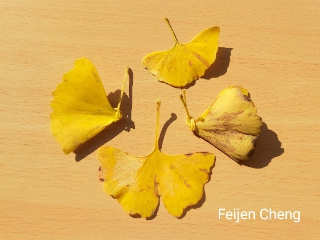 有些銀杏葉外形像一隻隻翩翩飛舞的蝴蝶,有些像扇子。用銀杏葉做了兩款蝴蝶,兩片葉子做成的蝴蝶有一對觸角,用一片做蝴蝶只有一個。