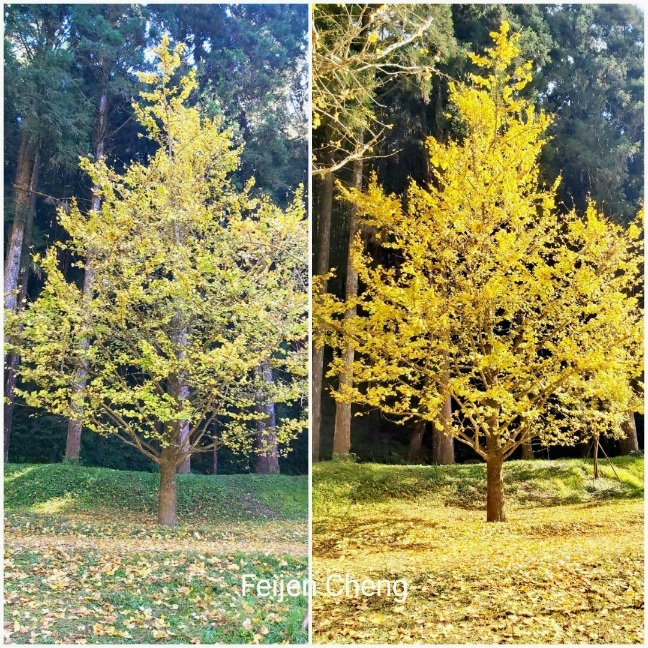 ↑上午與下午拍攝同一棵銀杏樹,光線顏色對比。