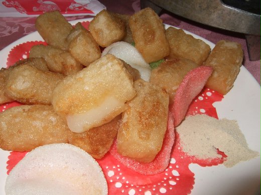 宜蘭糕渣是以大骨湯和雞湯, 雞肉熬上十幾小時, 再加入太白粉或玊米粉 (有些甚至加入 "吉利可"" 置入冰箱, 做成高湯塊, 再裹上太白粉, 熱油炸!