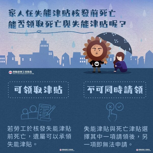 家人在災保失能津貼核發前死亡,符合災保死亡津貼請領規定,兩者不可同時請領,遺屬只能選擇其中一項請領。