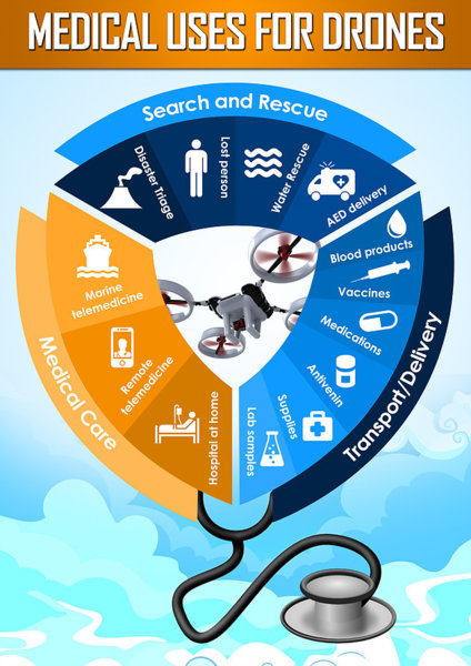 一般而言,在醫療上,最佳的運用領域應該是在”Speed is Everything”的災難醫學及重症醫學。多數文獻憑理論與經驗(颶風、地震等自然災害),認為最急需或適合供給的醫療物資(品項)如下: