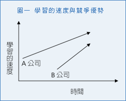 上述三大管理思想都與「學習」有密切關係,在21世紀高度變化、競爭的環境中,「學習」成為決定企業成敗的關鍵,如圖1所示,雖然A公司目前仍居上峯,呈現穩定的成長,但是因為B公司的學習速度快,很快就會趕上A公司而取得競爭優勢。
