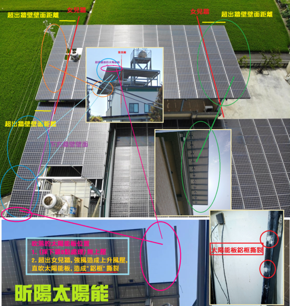 1. 其餘超出女兒牆太陽能板,也有可能再次遇到類似被強風吹落問題,如果遇到颱風應該會出大問題