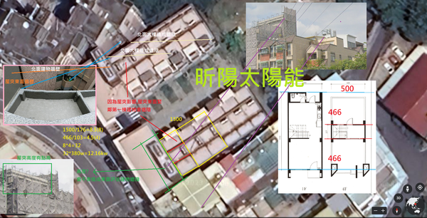 3. 建物被屋突分隔為南北兩側,屋突上方+女兒牆高度有點高度,造成鋪設太陽能板時只有南面屋頂不會被自有建物屋突造成遮陰狀況,每棟建物可以鋪設太陽能板區域過小,對於投資方來說不符合投資報酬