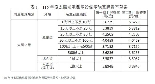 經濟部能源署今(28)日公布115年度各類別再生能源電能躉購費率草案,考量到近期光電設置法規變嚴,初步共識明年光電躉購費率皆維持今年下半年水準,10瓩以下屋頂型光電仍為每度5.6279元。