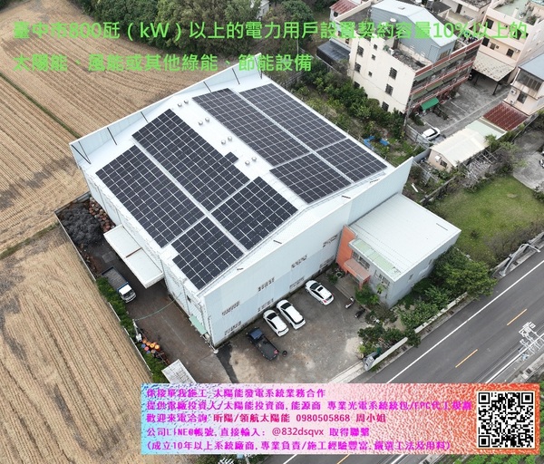 · 設置義務:公告指定的電力用戶應於公告日起三年內,於用電場所或臺中市適當場所,設置契約容量 10%以上的太陽能、風能或其他綠能、節能設備。