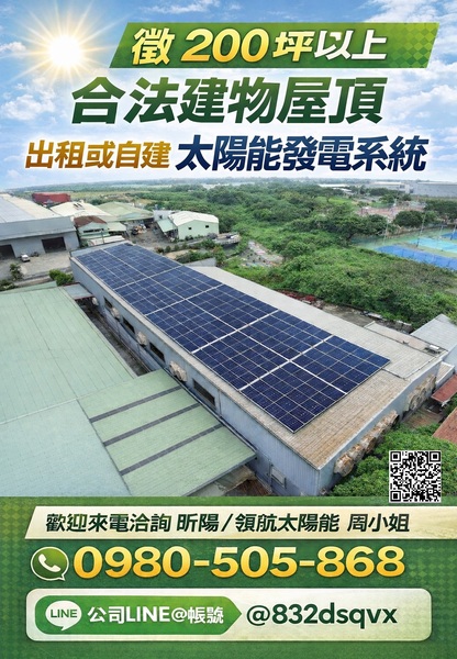 徵200坪以上合法建物屋頂以出租或自建太陽能發電系統