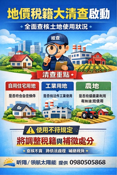 各地將展開地價稅籍大清查 重點涵蓋自用住宅用地、工業用地與農地使用情形