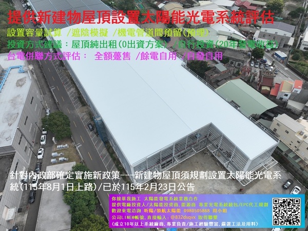 針對內政部確定實施新政策---新建物屋頂須規劃設置太陽能光電系統(115年8月1日上路)/已於115年2月23日公告