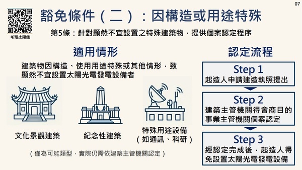 建築物經建築主管機關認定因構造、使用用途特殊或其他情形,顯然不宜設置太陽光電發電設備者,得免依本條例第十二條之一第一項規定設置太陽光電發電設備。