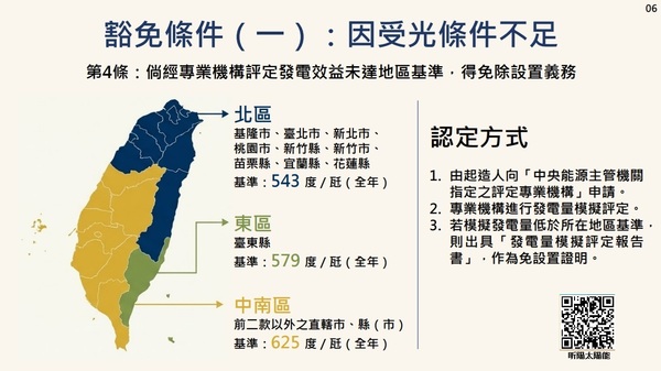 建築物因受光條件不足,經中央主管機關指定之評定專業機構評定其模擬發電量,每瓩全年發電量未達下列建築物所在地區之基準,並出具發電量模擬評定報告書者,得免依本條例第十二條之一第一項規定設置太陽光電發電設備: