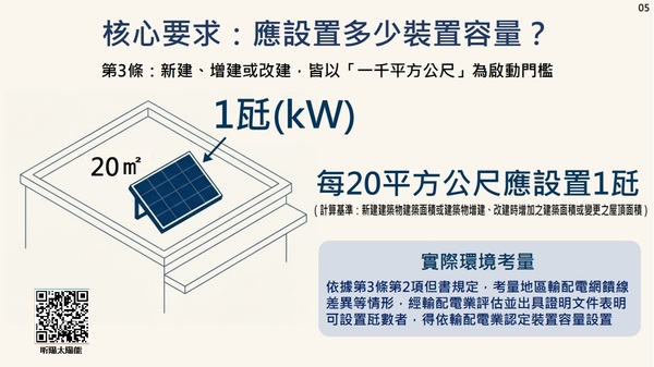 前項所定一定裝置容量,以新建建築物建築面積或建築物增建、改建時增加之建築面積或變更之屋頂面積為基準,每二十平方公尺應設置一瓩。但經輸配電業認定應減少設置裝置容量者,得依其認定之裝置容量設置。