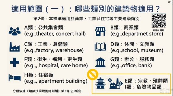 本條例第十二條之一第一項之建築物範圍,指建築技術規則總則編第三條之三所定A類、B類、C類、D類、F類、G類及H類建築物(以下簡稱建築)。