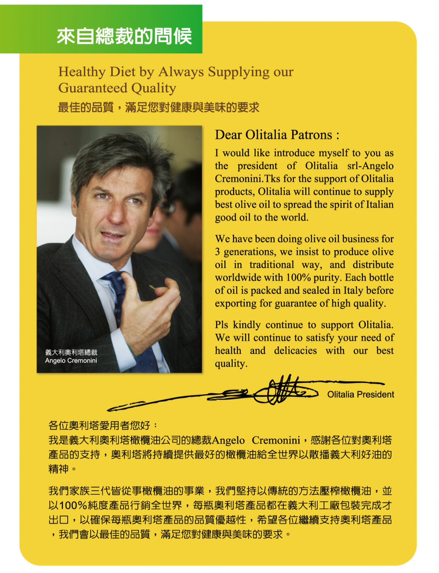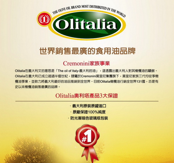 健康食尚新選擇!世界最暢銷食用油品牌-【Olitalia奧利塔】義大利原裝原罐進口,全世界最好的油!健康精純,是您饋贈摯親好友,健康自用的最好選擇!