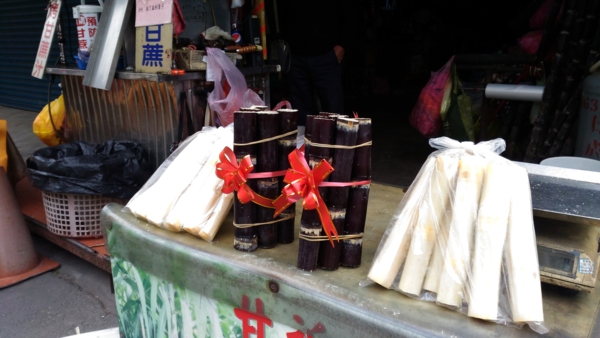 攤架上也有稍短帶皮一束五六節的甘蔗,一問,這可是近日拜拜要用的特殊供品。